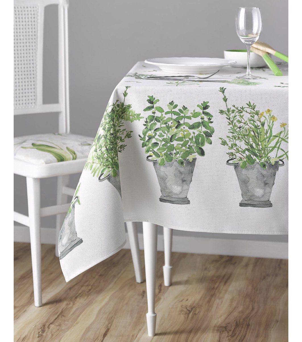 Model cu imaginea unor ghivece cu ierburi aromatice verzi, situate pe lungimea feței de masă.