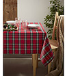 Fața de masă este confecționată din fir vopsit înainte de țesut.