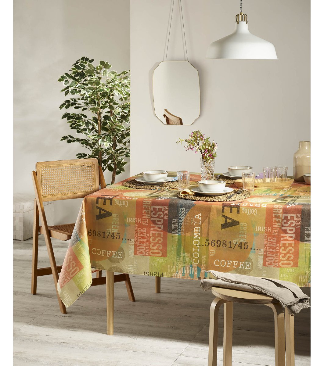 Atenas Față de masă rotundă cu înveliș rezistent la pete COFFEE D150 cu imprimeu Față de masă rotundă cu diametrul de 150 cm.