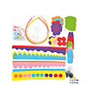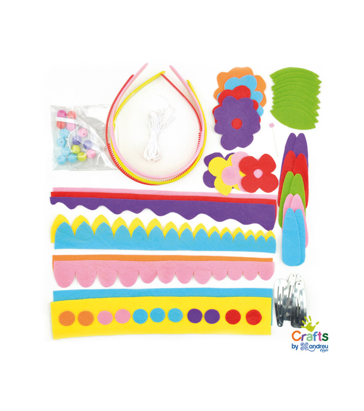 Setul contine trei diademe din plastic pentru par in culori diferite, panglici, flori si frunze din fetru in diferite culori, cordon elastic, margele, elastic, ac si trei agrafe.