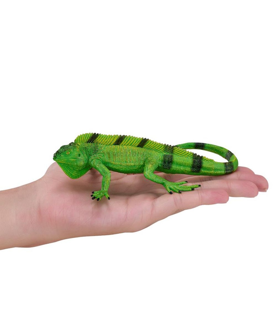 Cu solzi cu forme excepționale, o coadă lungă și o creastă caracteristică pe spate, această figurină surprinde aspectul unic al uneia dintre cele mai populare reptile tropicale. Iguana verde este o șopârlă erbivoră mare, originară din America Centrală și de Sud. Locuiește în pădurile tropicale și se găsește adesea în copaci lângă sursele de apă. Cu creasta sa caracteristică de spini pe spate și coada lungă, iguana este un simbol al faunei tropicale. Datorită dispoziției sale pașnice, este adesea ținută ca animal de companie.