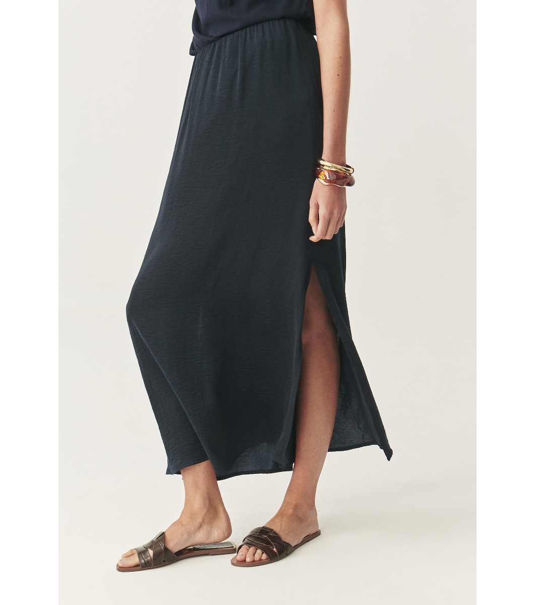 Fustă lungă și dreaptă cu talie elastică.