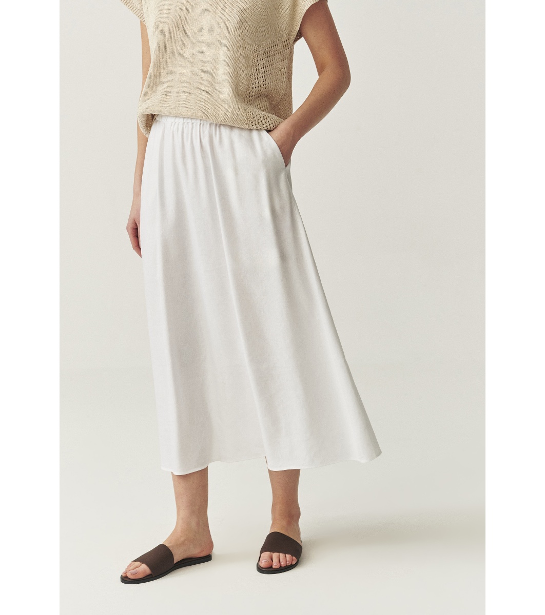 Fustă midi cu croială lejeră. Talie elastică. Buzunare laterale. Tiv neted, căzut.
