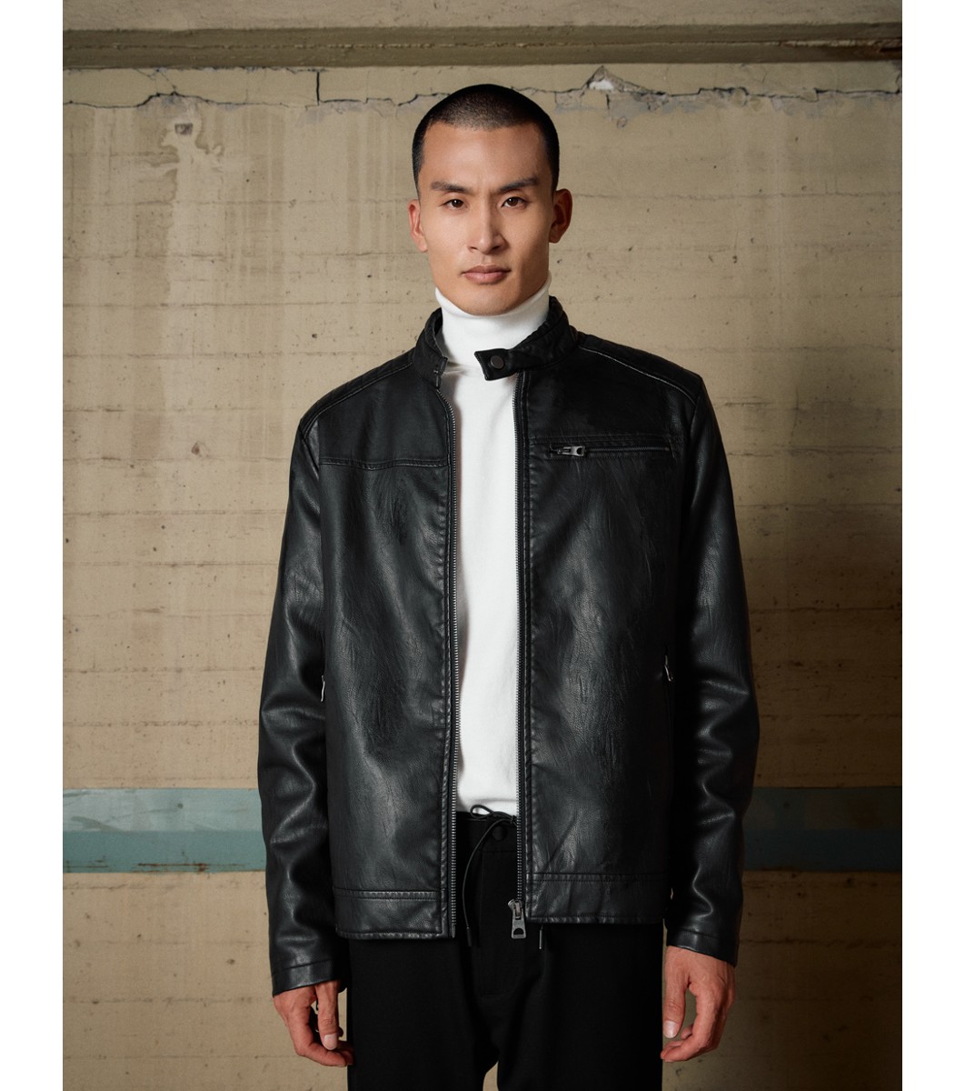 Biston Geacă bărbătească neagră din imitație de piele Benjamin Geacă scurtă cu fermoar pe toată lungimea