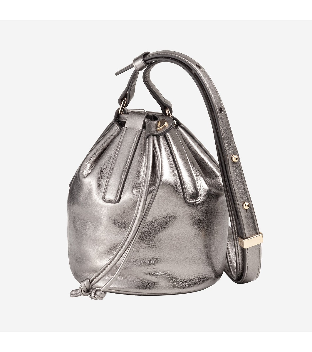 DuDu Geantă Filicudi din piele argintie Geantă mică cu fund rigid și formă cilindrică.