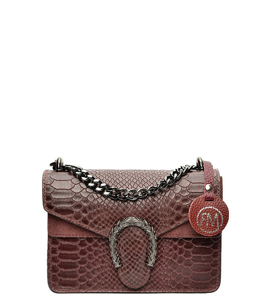 Geantă de damă din piele bordo cu relief cu model șarpe