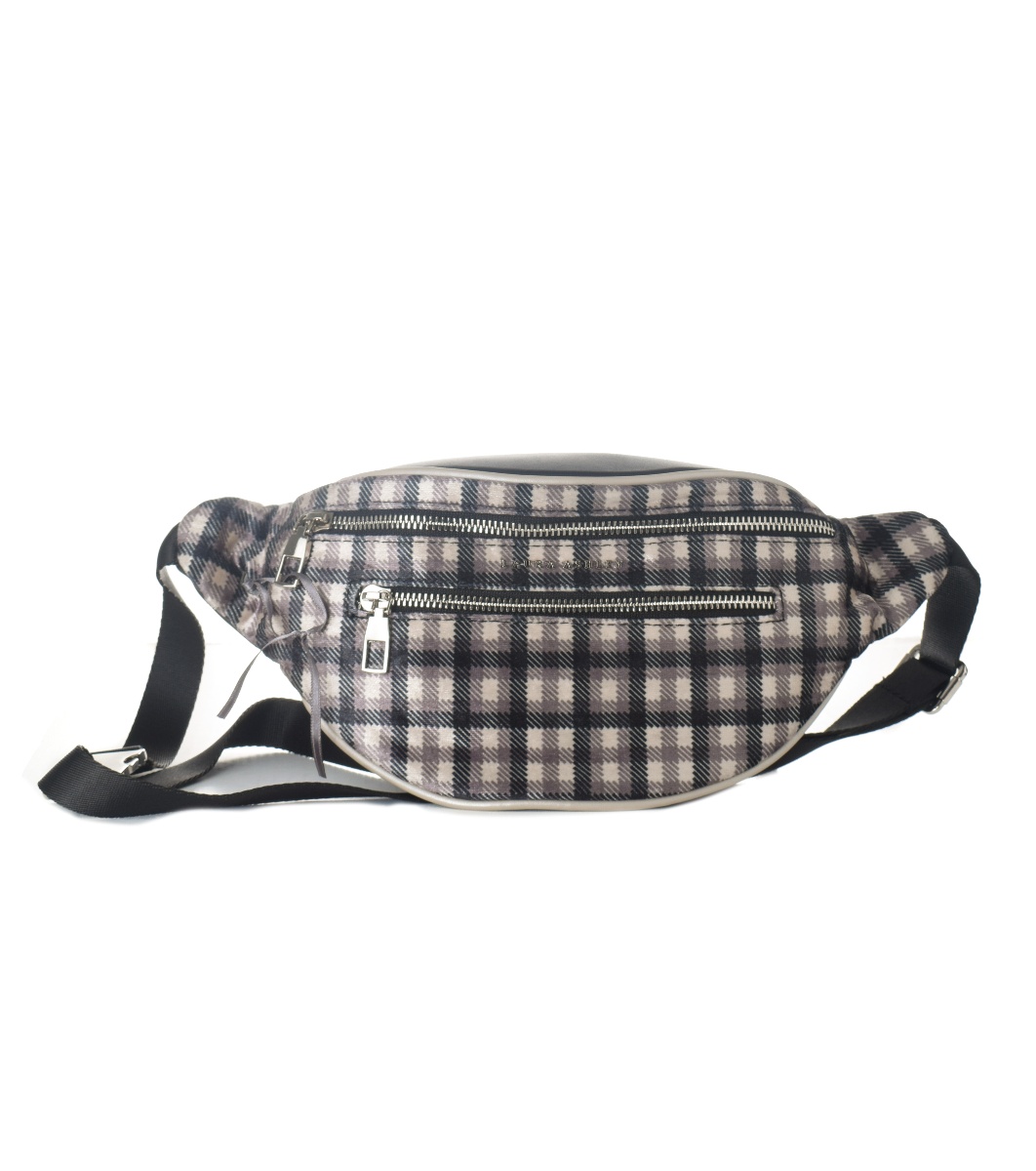 Geantă cu design în carouri și buzunar frontal cu fermoar. Are o curea reglabilă pentru purtare în jurul taliei sau peste umăr.