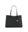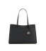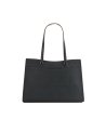 Geantă cu două mânere și închidere cu fermoar. Are un design curat și un element decorativ pe față.