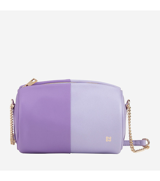 DuDu Geantă de umăr pentru femei din piele liliac Abigail Geantă cu formă cilindrică și curea reglabilă din lanț și piele.