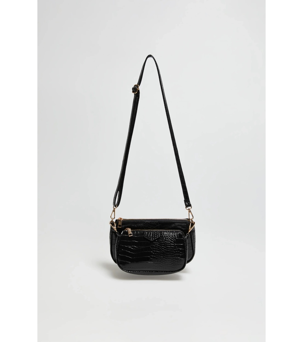 Geanta are un mâner lung reglabil și elemente metalice aurii.
