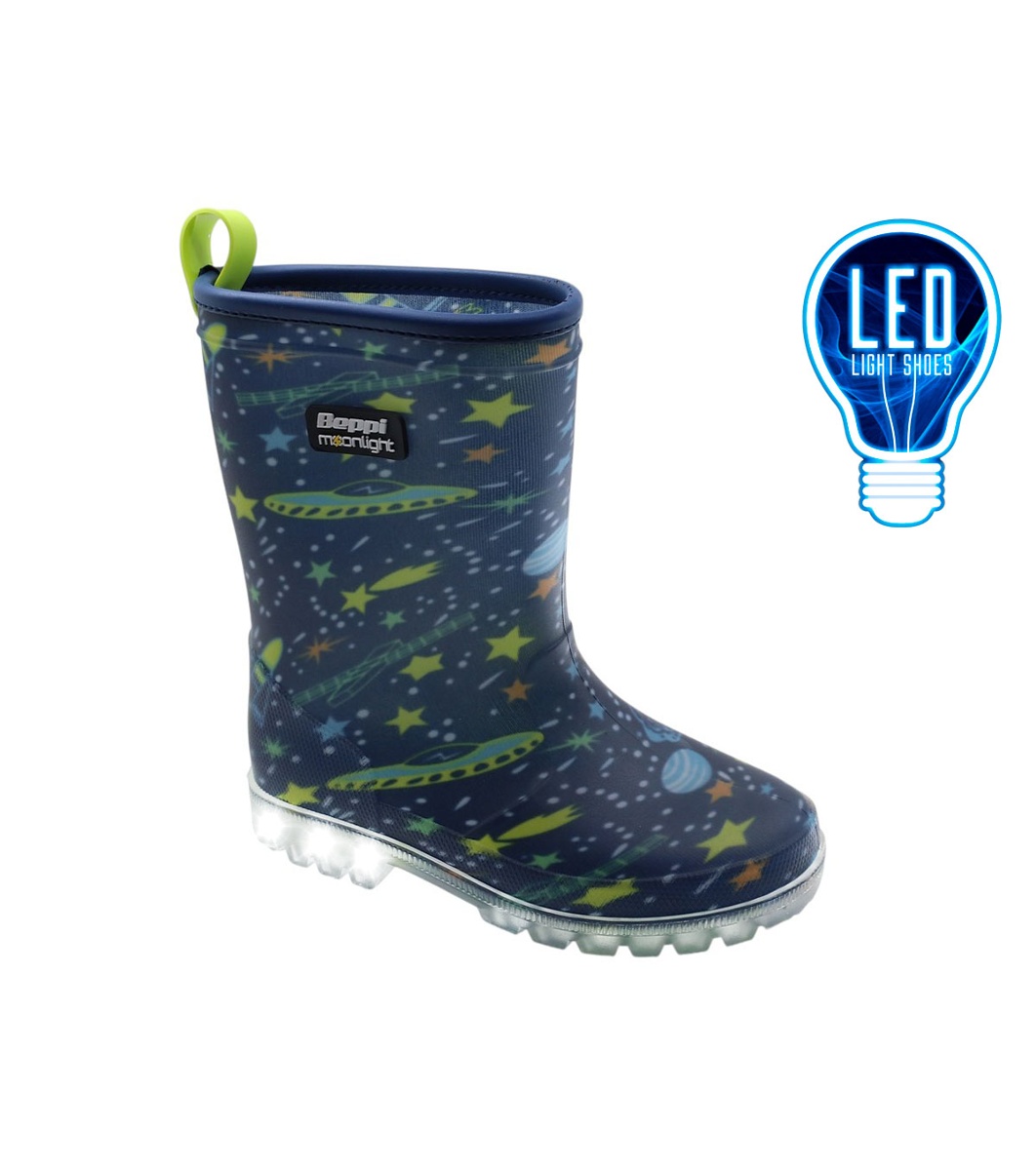 Beppi Ghete de cauciuc albastre pentru copii cu imprimeu spațial și talpă LED luminoasă Ghete de ploaie pentru copii cu imprimeu spațial