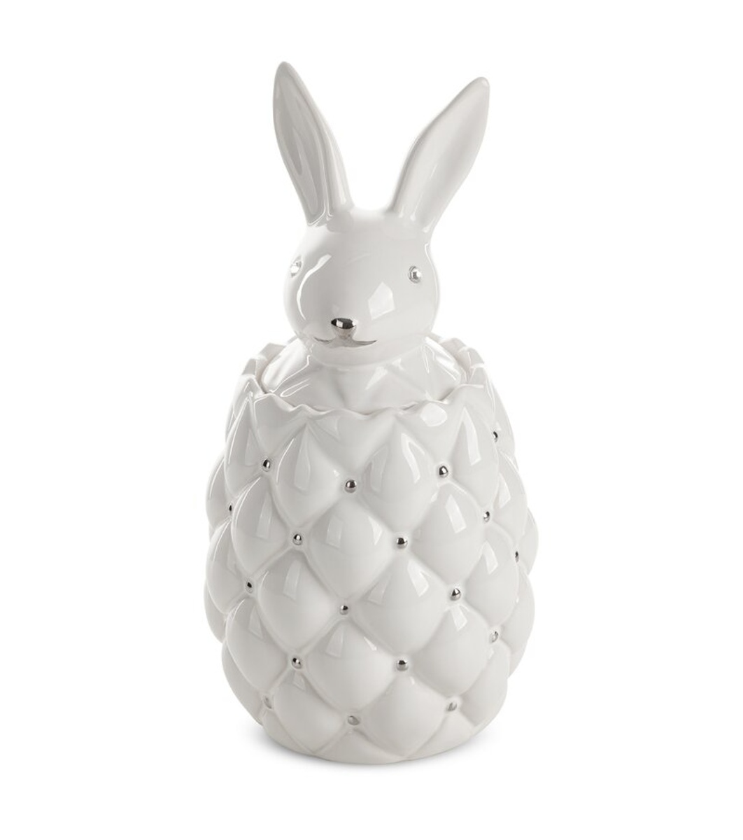 Ghiveci ceramic decorativ cu suprafață în relief și capac cu figurină iepure. Potrivit pentru depozitarea obiectelor mici sau ca accent decorativ independent în interior.
