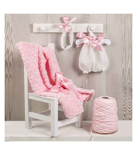Haine pentru papusa Maria, 43 cm - rochie cu panglica si patura roz, 43 cm
