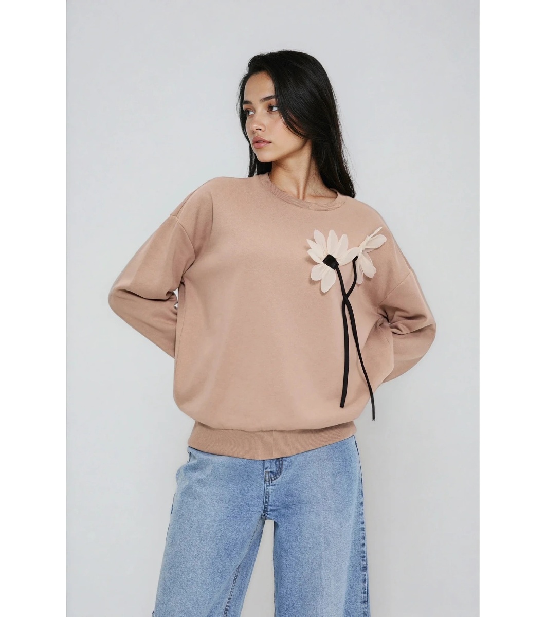 Moodo Hanorac maro cu aplicație florală Hanorac de damă cu decolteu rotund.