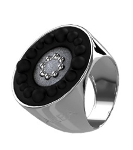 Inel elegant de damă cu formă ovală și o parte centrală expresivă. Decorațiune cu elemente în relief și motiv geometric.