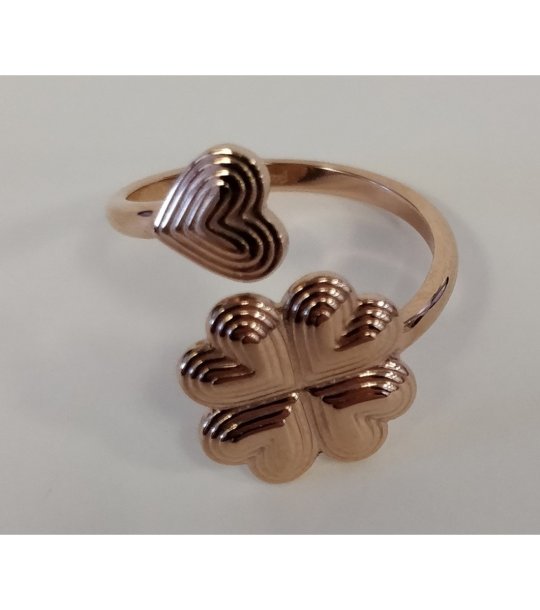 Inel elegant de damă cu design deschis, decorat cu motive în relief cu inimă și trifoi.