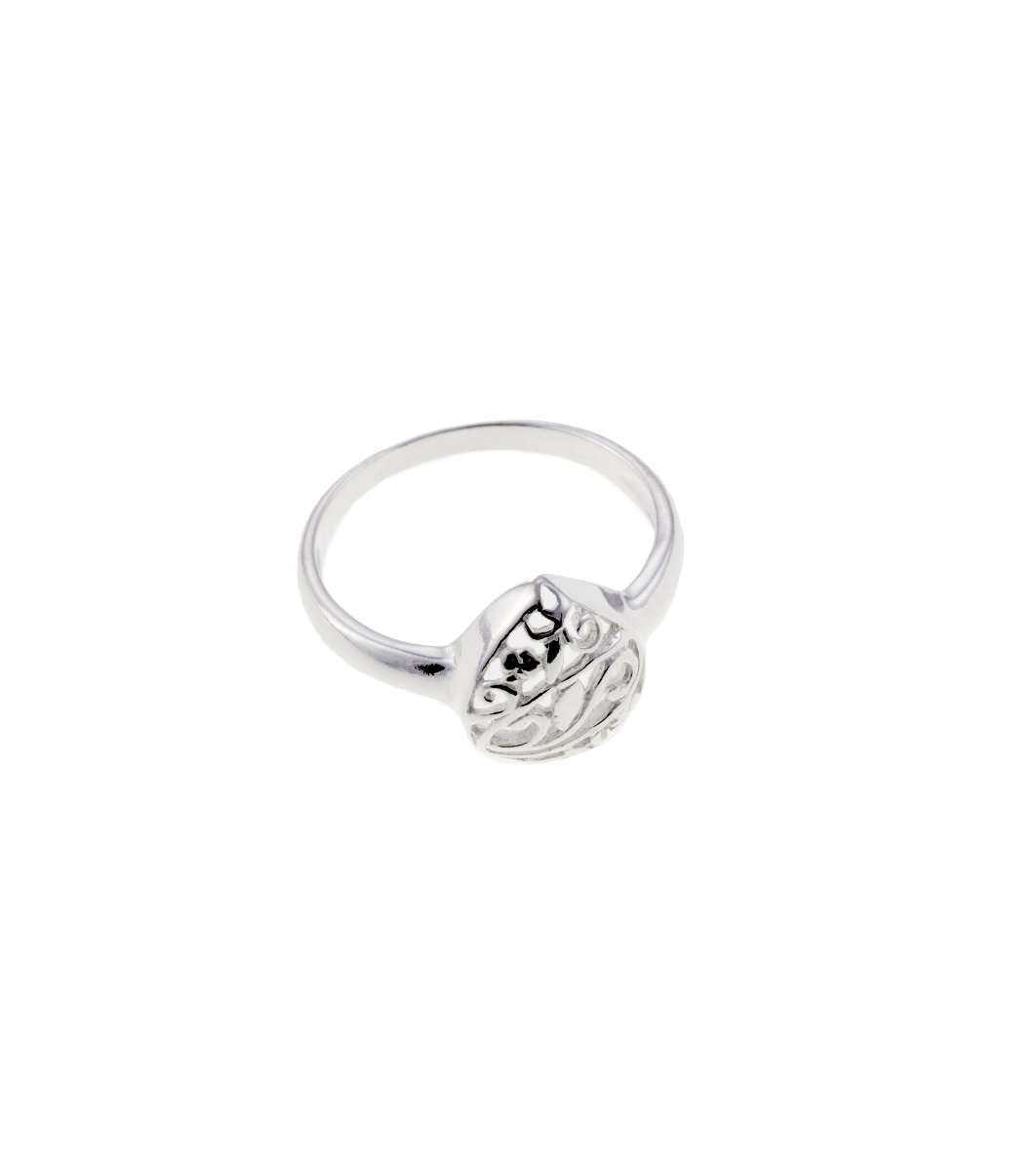 Inel elegant cu formă rotunjită și ornamente decorative în partea centrală.
