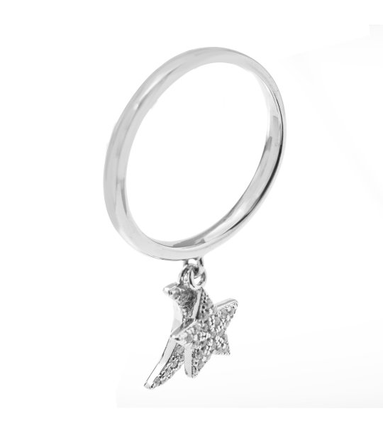 Inel elegant cu suprafață netedă și formă rotunjită. Include un pandantiv în formă de stea cu textură decorativă.