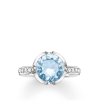 Inel de damă sofisticat cu o piatră centrală mare, rotundă.