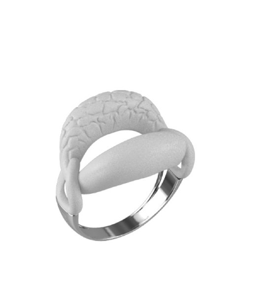 Inel elegant cu o formă interesantă și decorațiune convexă. Designul include o suprafață netedă și în relief, creând un efect vizual unic.