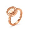 Inel elegant de damă cu incrustație în partea centrală. Inscripții decorative înconjoară partea incrustată, conferind un stil unic designului.