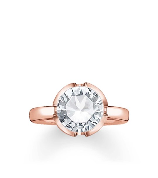 Inel elegant de damă cu o piatră rotundă centrală, înconjurată de o bază metalică netedă. Designul este curat și modern.