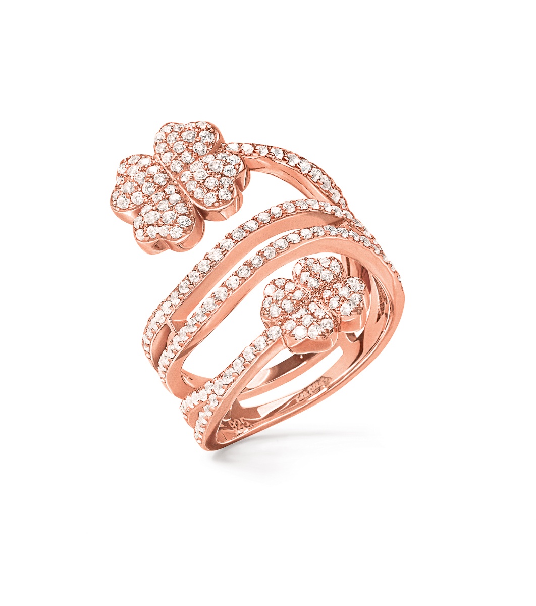 Inel elegant de damă, cu un design unic, decorat cu numeroase cristale. Inelul are numeroase benzi și elemente florale, oferind un aspect sofisticat.