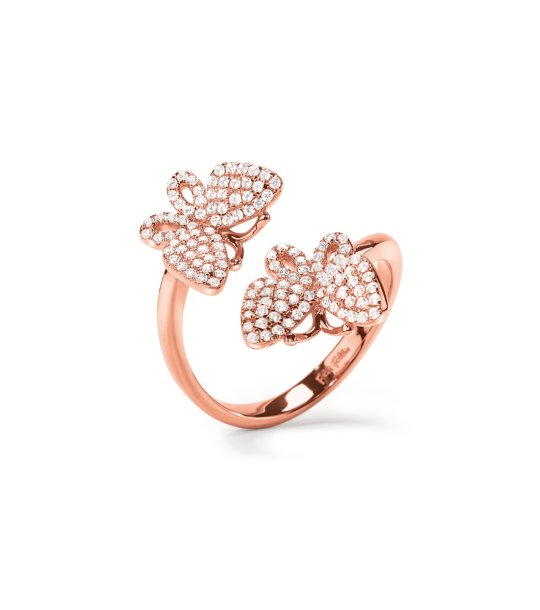 Inel elegant cu doi fluturi detaliați, decorat cu numeroase pietre mici. Designul este deschis, ceea ce permite ajustarea mărimii.