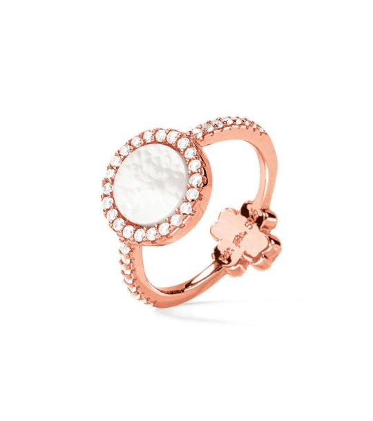 Inel elegant de damă, cu design rotund și pietre mici încrustate în jurul detaliului central. Inelul este completat de un element decorativ în formă de floare.