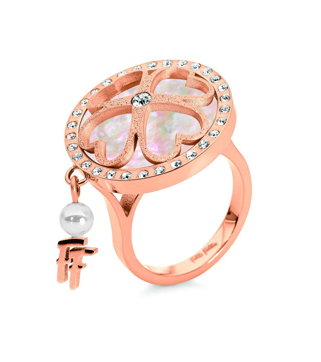 Inel de damă cu un element decorativ în formă de floare, înconjurat de pietre strălucitoare. Un pandantiv cu cheie și perlă adaugă un accent unic.