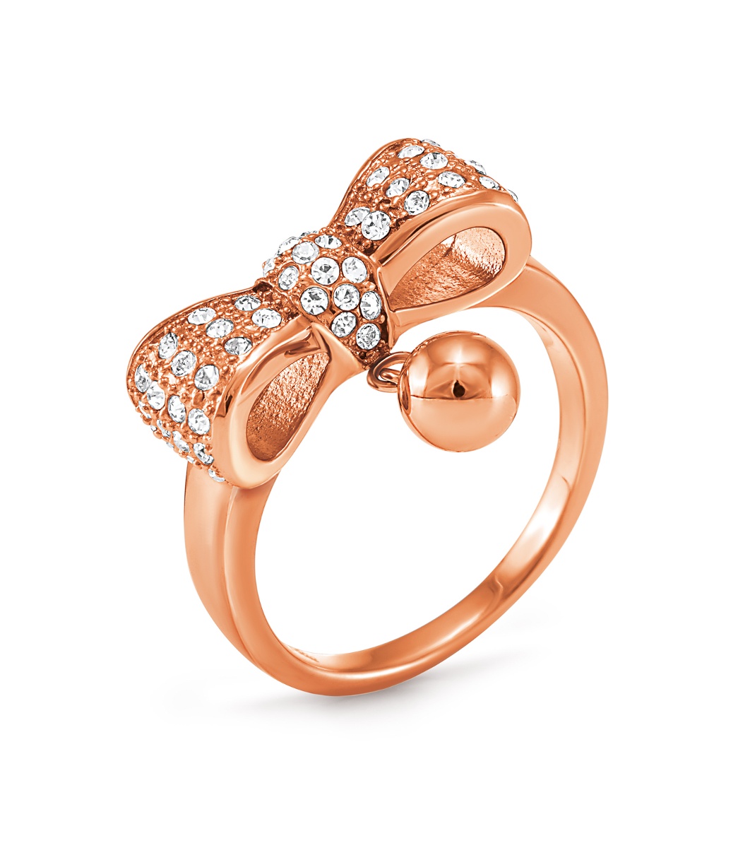 Inel elegant de damă cu panglică decorativă, decorat cu cristale strălucitoare. Designul include o mică bilă, adăugând un accent suplimentar.