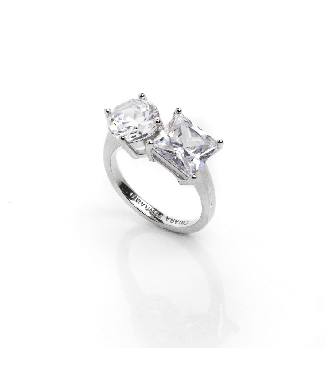 Inel elegant cu două pietre mari strălucitoare, una rotundă și cealaltă pătrată, așezate pe o bandă subțire.