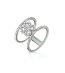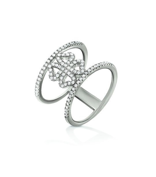 Un inel elegant cu două elemente conectate, decorat cu pietre strălucitoare în partea centrală. Inelul creează un aspect impresionant, cu o formă complexă și detalii care îl fac unic.