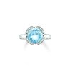 Inel elegant cu o piatră centrală rotundă, înconjurată de mici elemente decorative. Forma este clasică, potrivită pentru diverse ocazii.