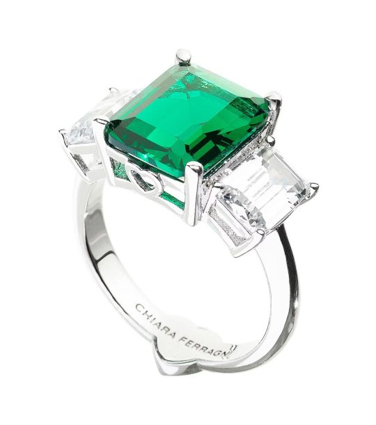 Un inel sofisticat pentru femei cu o piatră centrală mare înconjurată de două pietre mai mici. Inelul are un design elegant, potrivit pentru ocazii speciale.