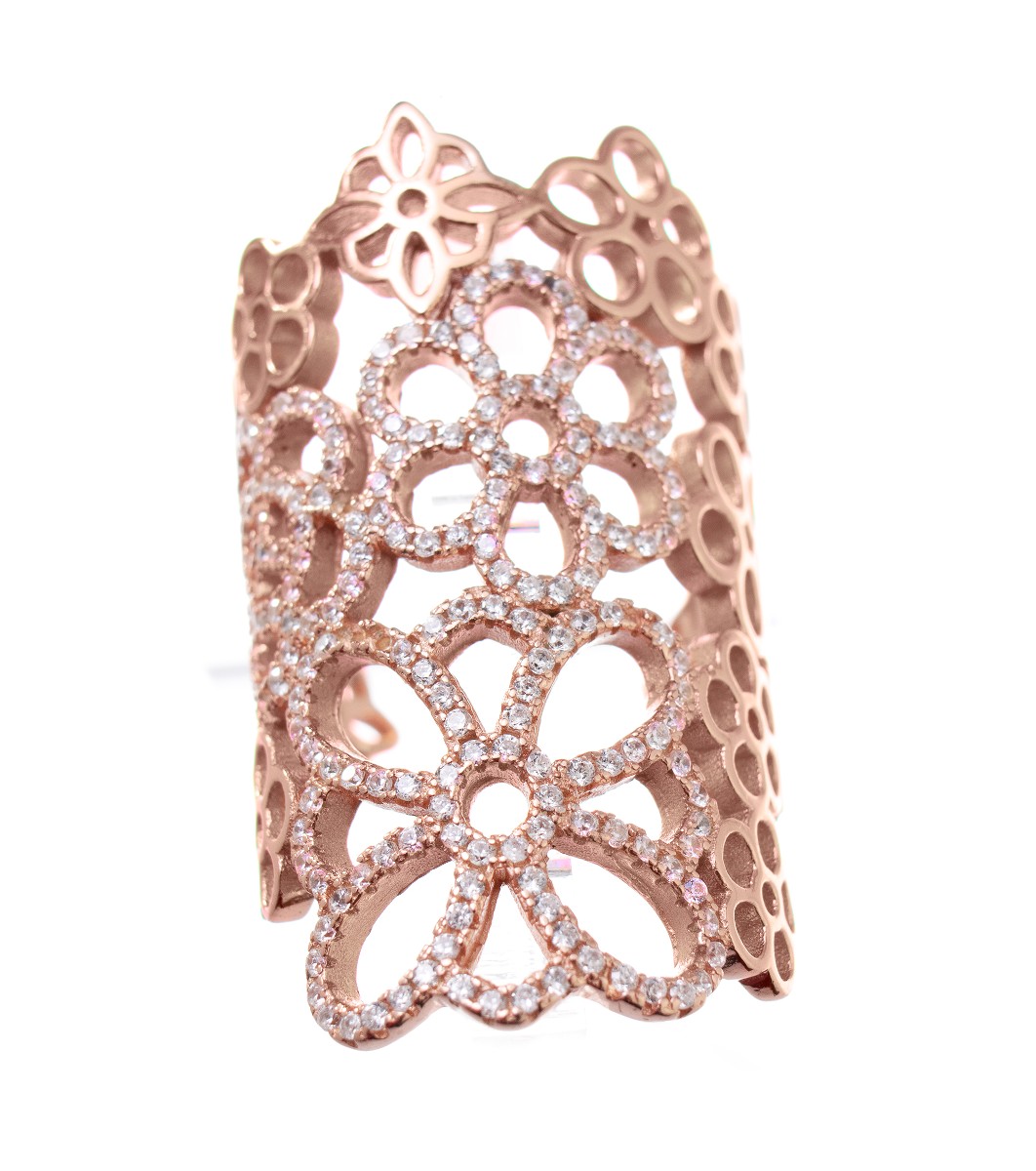 Inel elegant cu design ajurat și elemente decorative. Inelul este decorat cu cristale strălucitoare aranjate într-un model floral rafinat.