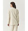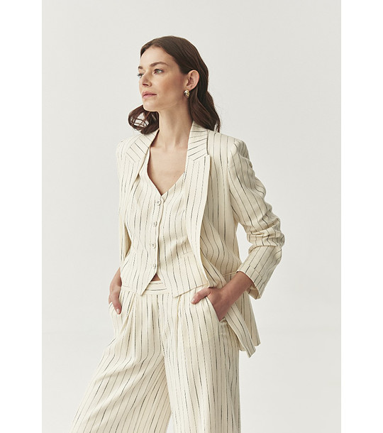 Jachetă de damă cu croială dreaptă și lungime până la șold. Modelul are guler cu rever și mâneci lungi. În față are două buzunare laterale cu clape. Închiderea este fără nasturi vizibili. Jacheta are o căptușeală subțire și un model fin cu dungi verticale.
