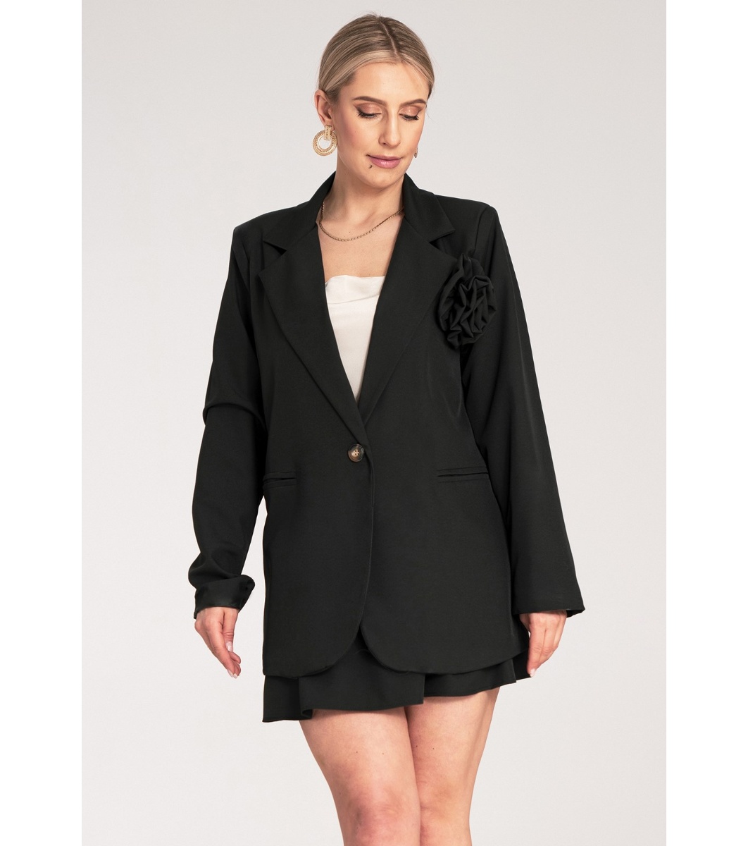 Figl Jachetă neagră de damă cu floare decorativă Mia Guler și revere