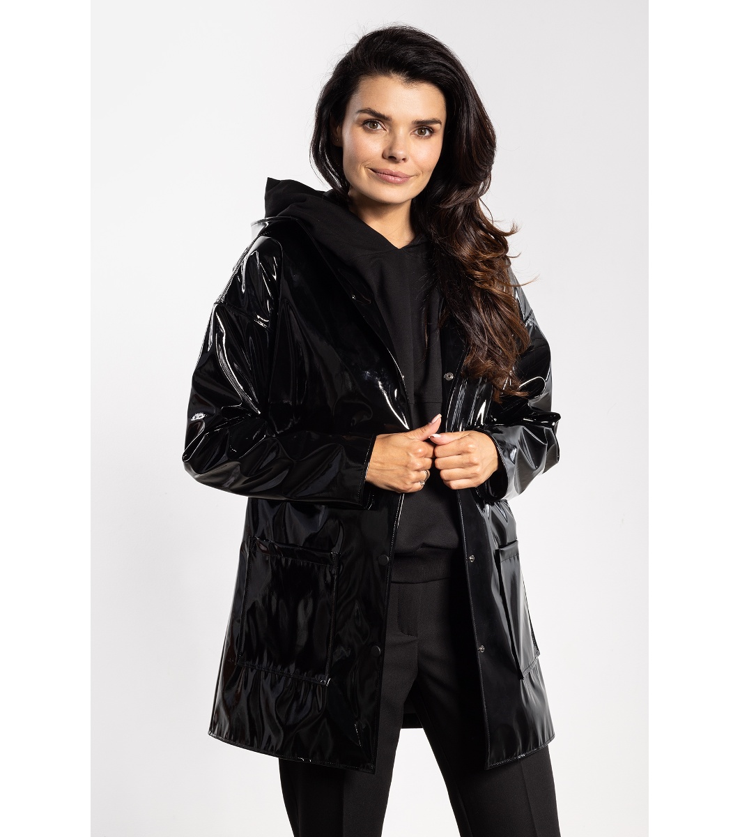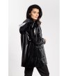 Awama Jachetă neagră pentru femei cu efect lucios Jachetă lungă de ploaie pentru femei cu o suprafață lucioasă și impermeabilă.