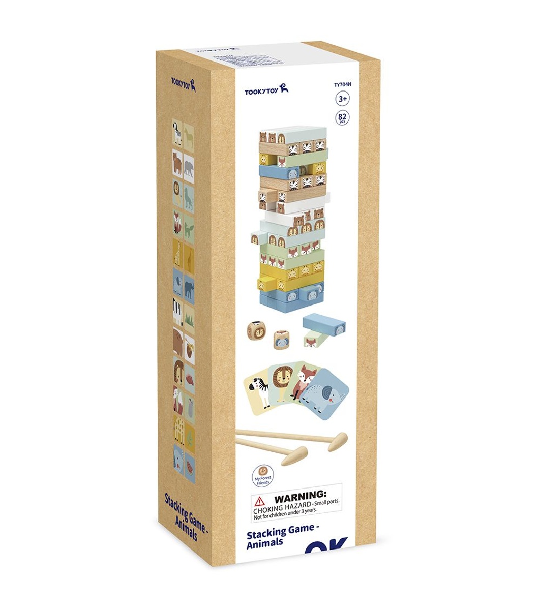 Setul include 82 de elemente: 78 de blocuri de lemn cu imagini gravate cu animale (leu, elefant, girafă, maimuță etc.); 2 zaruri cu simboluri de animale care determină tipul de blocuri îndepărtate; 2 ciocane pentru împingerea blocurilor; cărți educative cu animale pentru aranjare.