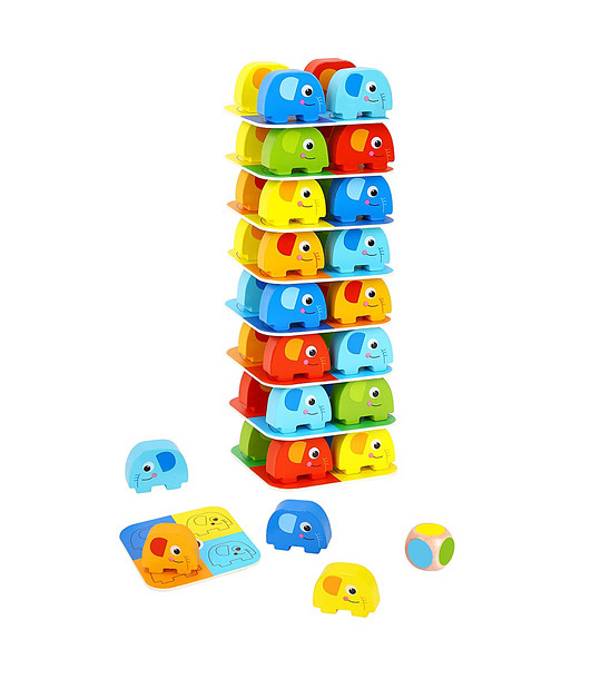 În set veți găsi elefanți din lemn de diferite culori care construiesc un turn mare, cărți colorate și un zar de lemn. Elefanții sunt pictați pe cărți. Trebuie să vă aranjați turnul astfel încât culorile elefanților să fie aceleași ca în avionul de sub ei.