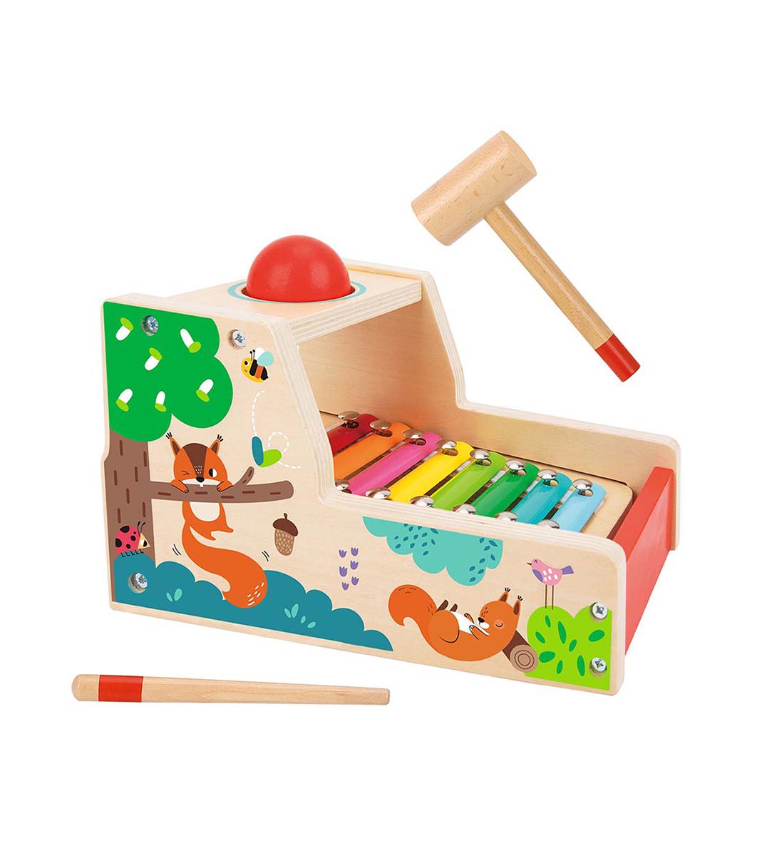Xilofonul de 8 note îl va introduce în lumea muzicii, iar în timp ce bate cu ciocanul, micuțul se va distra și va învăța să țină timpul. Designul superb și vesel va aduce și mai multă liniște și stare de spirit în joc.