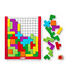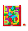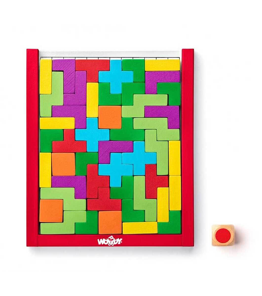 Jocul puzzle din lemn Woodyland poate fi jucat în multe feluri. Jocul conține 48 de elemente colorate în diferite culori și forme și un zar cu culori.
