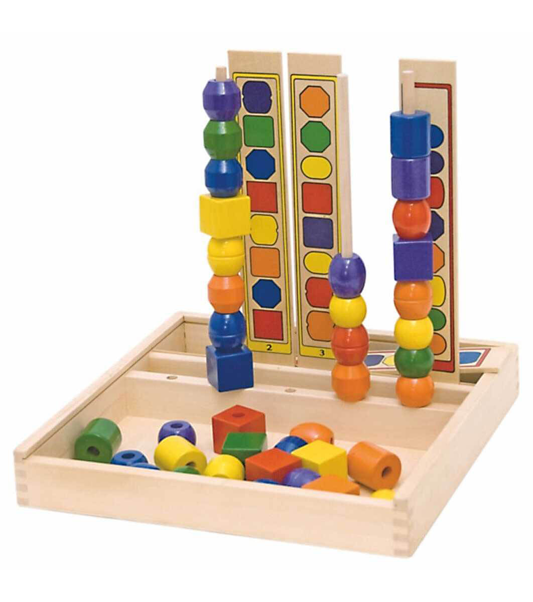 Jucăria este o adevărată provocare pentru logica copiilor și un exercițiu util pentru mâinile mici. Copilul trebuie să înșire mărgelele din lemn multicolore, care vin în diferite forme după modelele și culorile date. Trebuie să se potrivească corect atât cu forma și culoarea, cât și cu ordinea de aranjare a margelelor. Scopul este de a aranja formele așa cum sunt pe diagrama primită. În cutie sunt găuri în care sunt montate 5 bețe de înșirare din lemn, pe care copiii înșiră repetând modelele date.