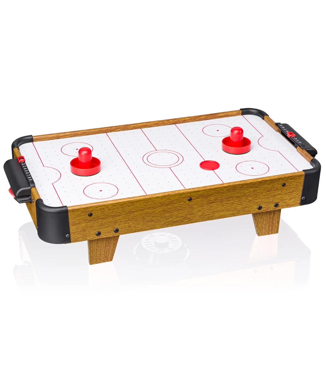 Air Hockey de la Popular, un joc de masă din lemn, este o versiune compactă a jocului clasic de hochei pe aer, conceput pentru a fi jucat pe un birou sau o masă.