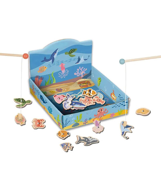 Setul include:- 1 cutie care servește drept teren de joacă;- 2 undițe magnetice;- 10 animale marine diferite (pești, stele de mare, crabi etc.)