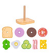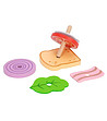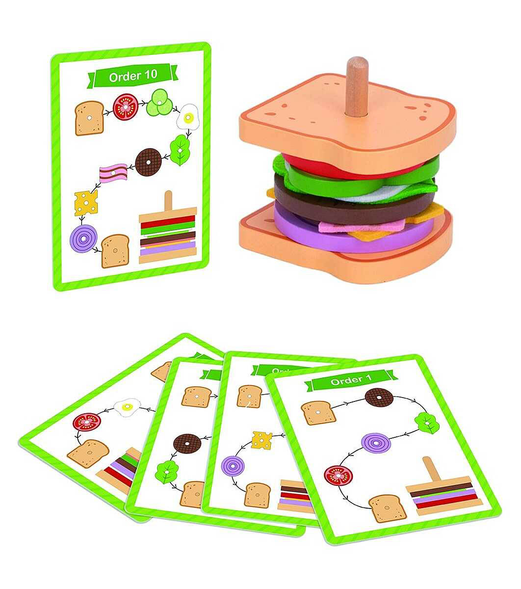 1-2 ani, 2-3 ani, 3-5 ani, 5-7 ani, 7-10 ani Una dintre deliciile preferate ale copiilor, acum sub formă de sfoară Aceasta este o provocare pentru dexteritate, observație și creativitate. Un asistent în procesul de învățare a culorilor și a formelor.  Stimulează imaginația, dexteritatea, abilitățile motorii fine și coordonarea mână-ochi. Un joc de rol preferat al adolescenților. Setul include 15 piese: 10 elemente din lemn cu care se "pregateste" un sandvici 5 cartonase cu 10 moduri diferite de preparare (sabloane); Dimensiuni: 9 x 10 x 10,2 cm Potrivit pentru copii peste 3 ani.