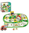 Teren de joc-puzzle din 9 piese, garaj 3D pentru reparații, bol, 4 mașinuțe de jucărie, 1 arc pentru linia de sosire, zaruri cu culori și zaruri cu numere.