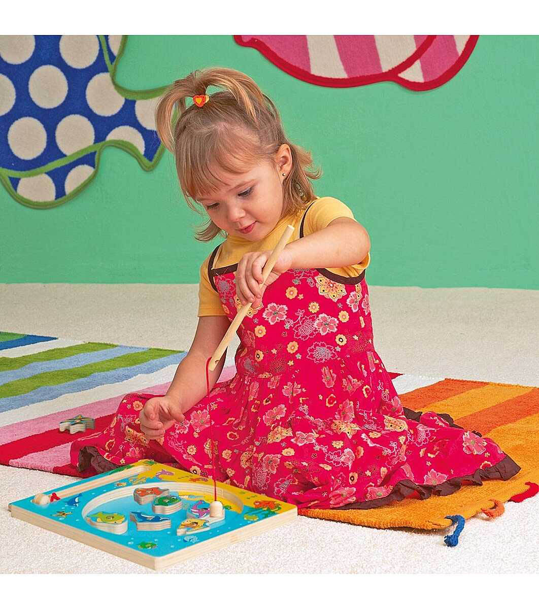Woodyland Joc pentru copii Pescuitul  Setul este format dintr-o tabla de joc "piscina" din lemn, 8 pesti din lemn colorati si doua undițe de pescuit din lemn cu vârfuri magnetice. Câștigătorul este micul pescar care prinde cel mai mult pește în cel mai scurt timp.