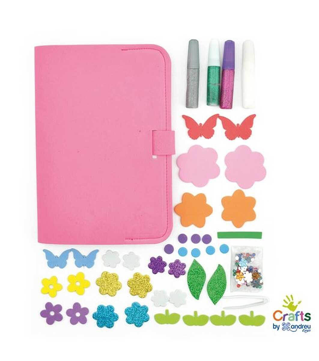 Andreu toys Jucarii Andreu, caiet de bricolaj Setul contine: caiet cu legare, tip EVA; formulare de aplicare de la EVA; lipici; adeziv cu sclipici; cristale; penseta.
